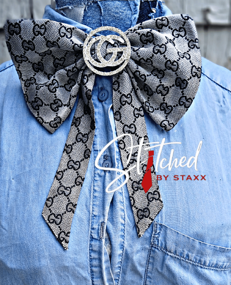 Each bow is custom made, so fabric placement, embellishments, brooches, and finishing details may vary. Your piece will stay in the same style family, but it will not be an identical twin.