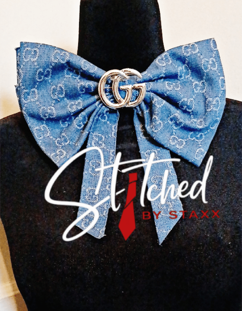 A distressed denim bow with an unfinished edge and baddie-style attitude. Embellishments and denim details may vary, making each bow slightly different while staying in the same design family.