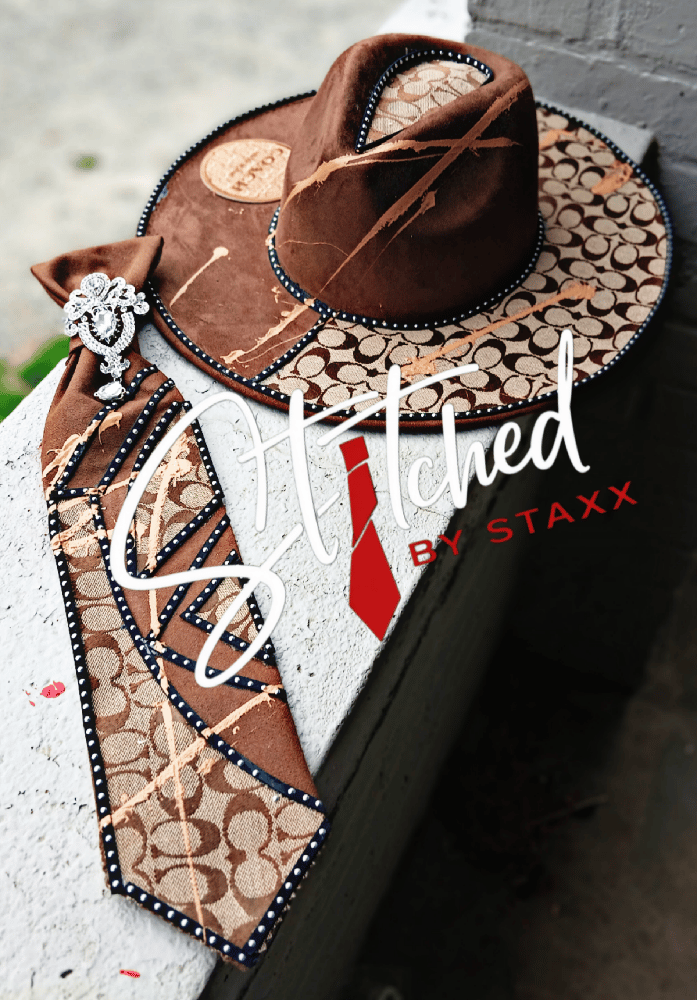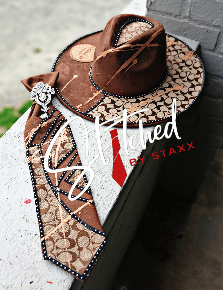 Cookies & Creativity is a mocha brown fedora and tie set, blending luxury with artistic flair. Inspired by Coach, this ready-to-ship set is for those who embrace their creativity while making a bold statement.