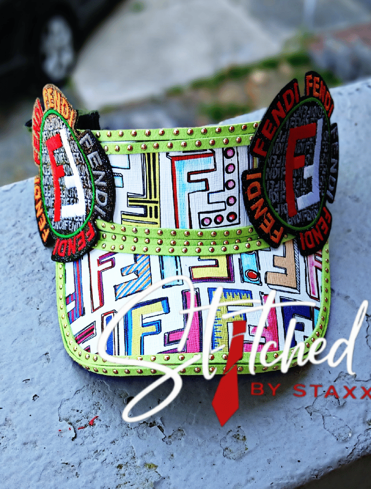 This custom visor is loud, colorful, and full of personality. Designed with bold printed fabric, lime trim, gold stud details, and statement patches for a standout finish.