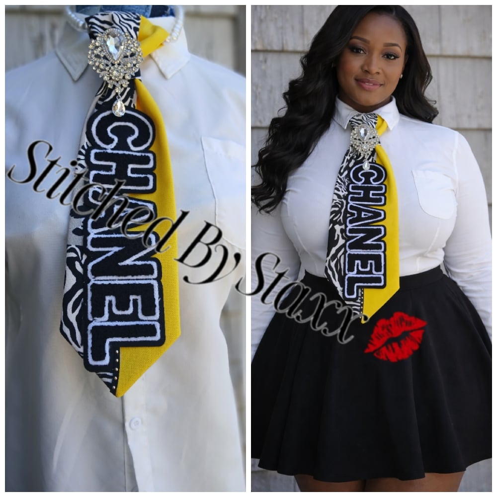 Golden Glam is a one-of-one statement necktie designed with a striking yellow base and bold black-and-white contrast details for a fashionable, eye-catching finish. Topped with glamorous embellishment, this piece blends playful color with elevated style. It’s a standout accessory for the one who loves to wear confidence out loud.